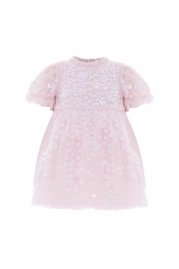 The Confetti Baby Dress in Peony Pink/Cream. This pretty design features sequin-embellished flower motifs that cascade down the dress in a confetti pattern. The puffball skirt is crafted from soft,gathered mesh,while the tulle frills on the neckline and shoulders add a delicate touch. Developed with short puff sleeves finished with ruffled cuffs,and the dress is lined in luxurious cotton voile for comfort. Complete with coordinating cotton dobby bloomers,edged with frills. Let your little one shine in the spotlight.