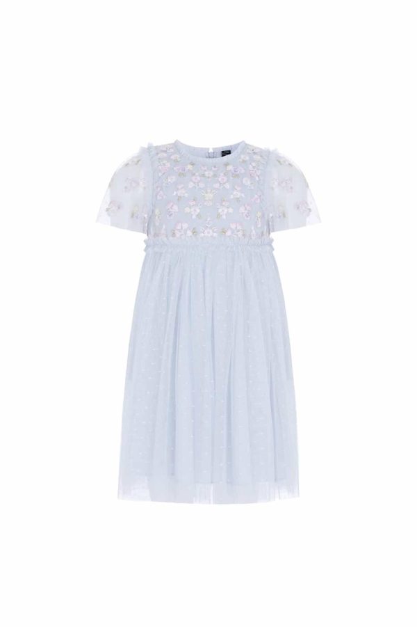 NEW SEASON. The Evening Primrose Bodice KIDS Dress in Cloud. The bodice of this dress is decorated with intricate floral embroidery,inspired by a 1930’s tea dress. The skirt of the dress is beautifully developed with our signature Needle & Thread tulle and fetures chevron frills on the hem. The perfect dress for all your little one’s upcoming occasions.