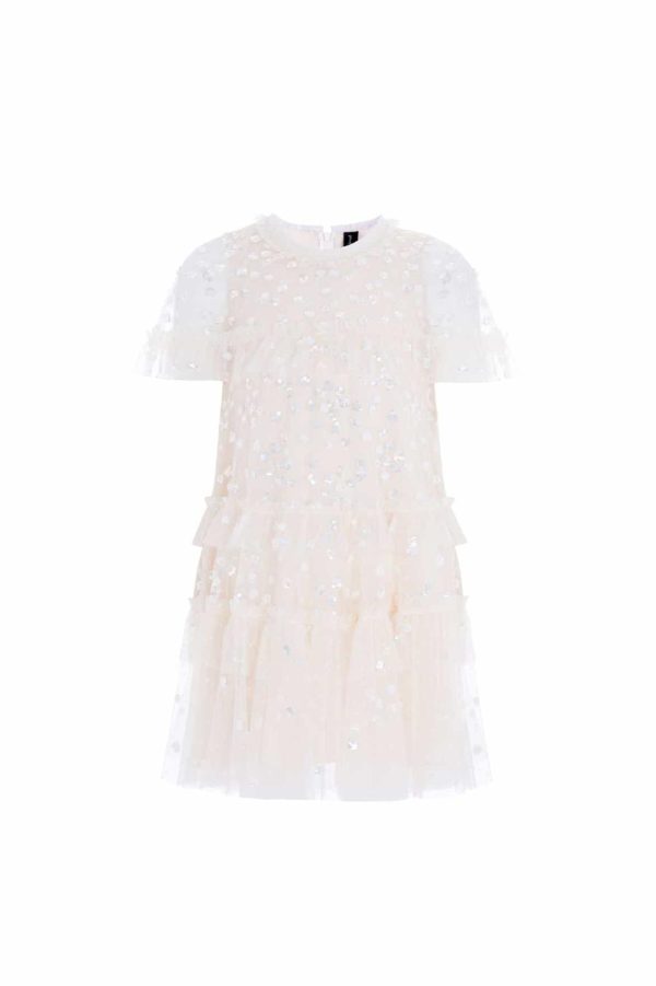 The Leila Dot Tiered Cape Kids Dress in Cream. This dress features shimmering dot motifs and foil-coated sequins for a lustrous,glittering effect. A playful cape with frills and signature Needle & Thread tulle frills at the neckline add charm,while the loose-fit silhouette ensures comfort. The frothy,tiered tulle skirt creates volume for perfect twirls. A magical,timeless piece for your little one’s wardrobe.