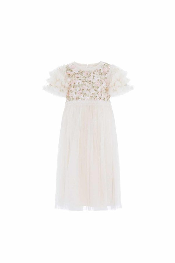 The Posy Bodice Kids Dress in Cream. The bodice of this dress is adorned with intricate floral bouquet motifs,with shimmering sequins scattered all over to create a glistening effect. The skirt is crafted with layers of soft,delicate tulle and net for signature Needle & Thread detailing. The perfect dress for a special occasion,flower girl moment or a warmer weather getaway.