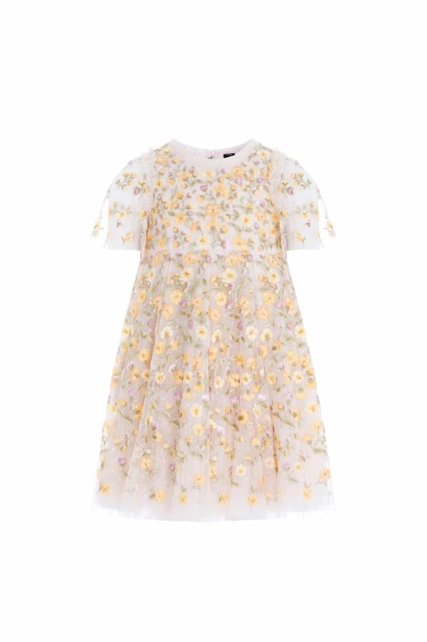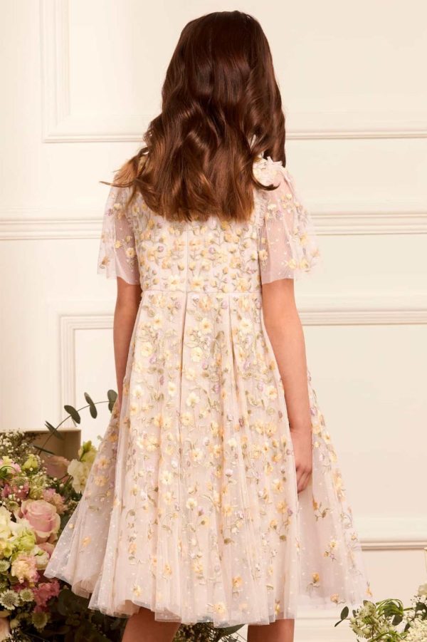 The Posy Pirouette Kids Prom Dress in Cream showcases intricate embroidery inspired by the ‘summer posy’ print,with delicate florals scattered across the bodice and flowing towards the hem. The generous layers of net and tulle create a sweeping,voluminous skirt,making it an ideal choice for special occasions.