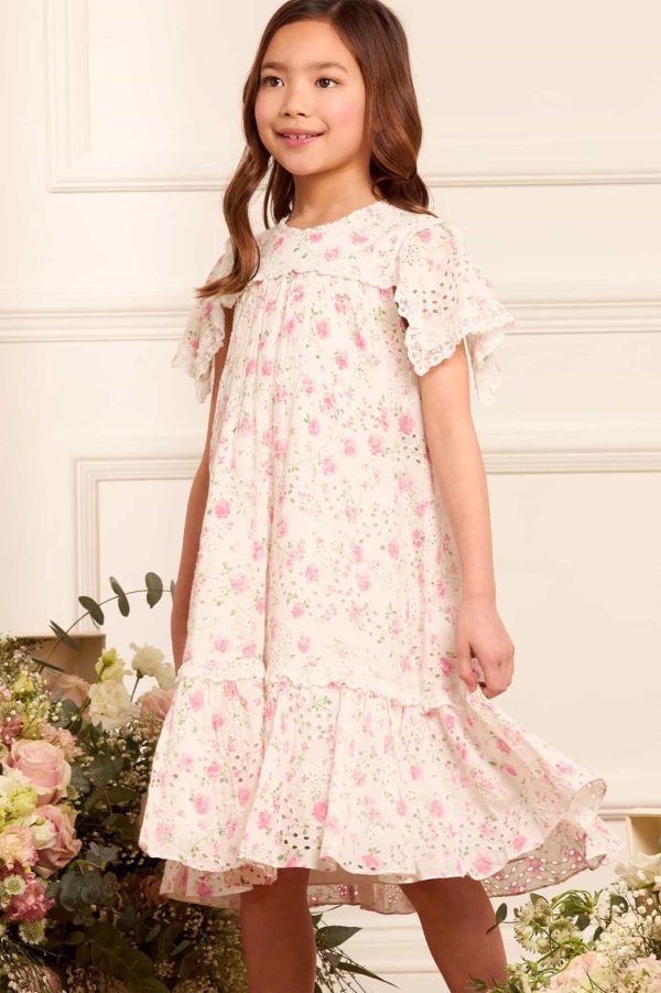 NEW SEASON. The Rose Ditsy Chiffon Broderie Kids Dress in Moonshine/Pink features a romantic 1800s-inspired floral print and is crafted in broderie anglaise cotton with delicate scallop embroidery. The handkerchief sleeves and yoke are finished with softly gathered lace,while the loose fit and frilled neckline ensure comfort. The gathered skirt tier,edged in lace,adds volume—perfect for effortless elegance.