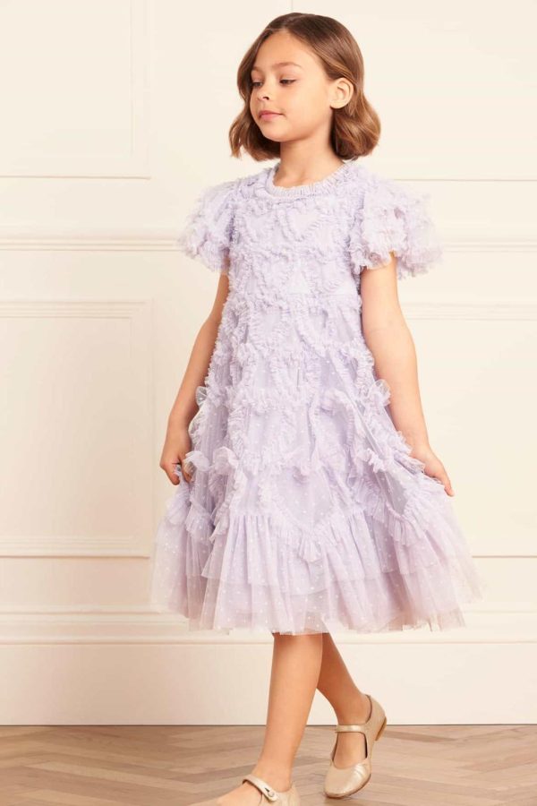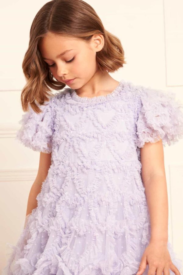 NEW SEASON. The Amorette KIDS Dress in Dusk Lilac. A signature Needle & Thread KIDS dress for the season ahead. Beautifully adorned with a love heart motif,made from gently gathered delicate tulle. Designed with playful,frothy sleeves created by using layers of delicate tulle and frills. Featuring a generous,voluminous skirt layered with tulle and net for a magical silhouette. The perfect mini-me version of our RTW style.