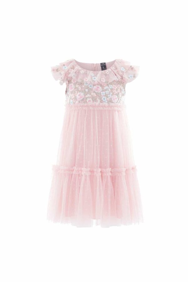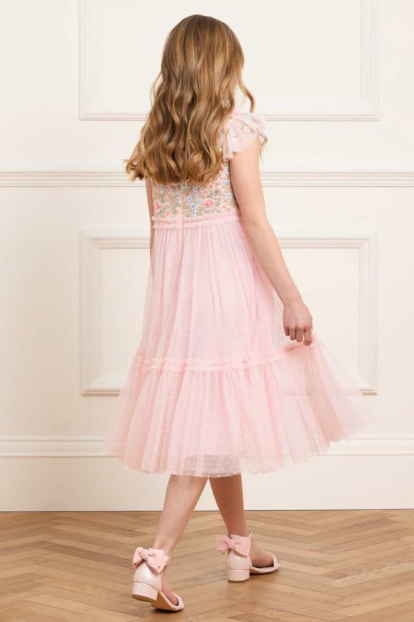 The Antoinettes Floral Bodice KIDS Dress in Dusk Pink. This enchanting dress features a beautifully embroidered bodice with multicoloured floral bouquets,inspired by the lavish interiors of Versailles. Tulle frill neckline and sleeves are dotted with ditsy floral motifs,while the softly gathered skirt tier adds volume for a twirl-worthy finish. The perfect dress for a special occasion,a charming flower girl moment,or simply for dressing up.
