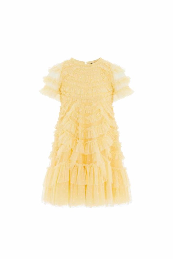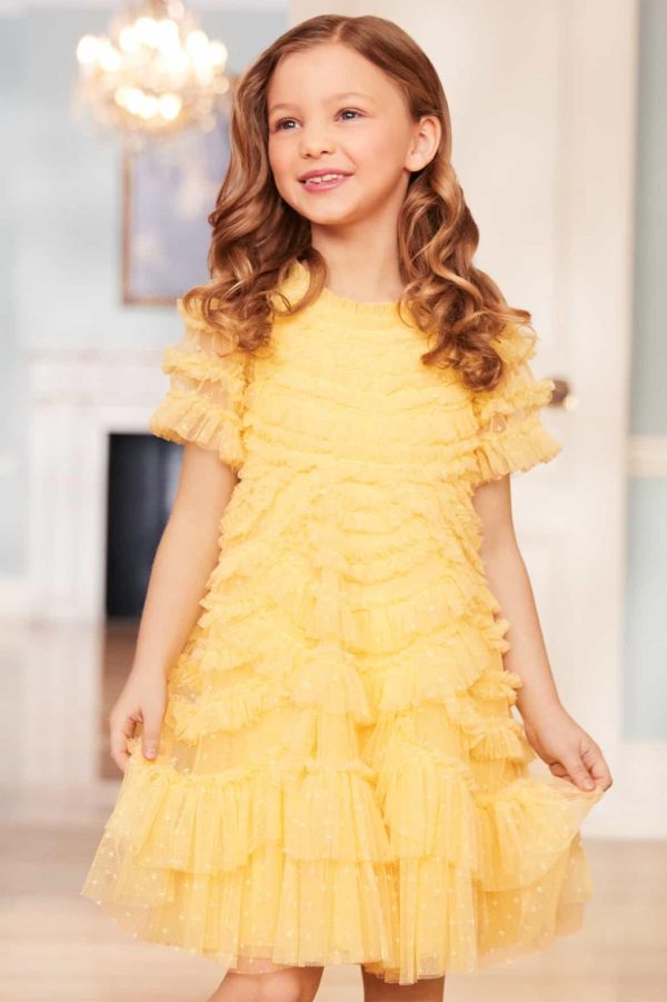The Marilla Ruffle KIDS Dress in Lemon. Beautifully designed with frothy tulle and interlocking scallop shapes to create a playful texture. This pretty style features elegant short sleeves,a round neckline and a full skirt. The perfect statement style for your little one.