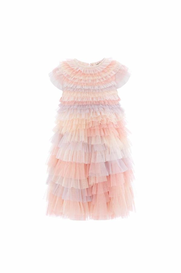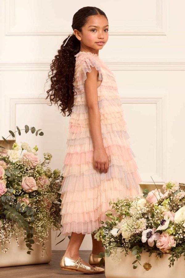 NEW SEASON. The Petra Ruffle Kids Dress in Desert Rainbow is a heritage Needle & Thread design,featuring soft tulle frills that graduate in size towards the hem,creating a beautiful ombré effect. Designed with delicate ruffled trims adorn the neckline and armholes,while layered tulle and net in the skirt add volume—ideal for twirling.
