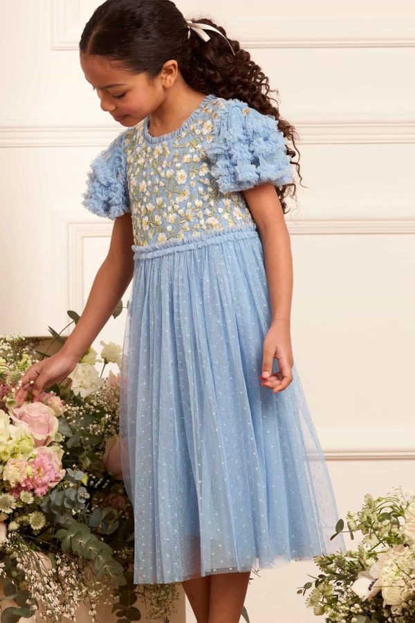 NEW SEASON. The Posy Bodice Kids Dress in Sky Blue/Cream features a 1930s-inspired print with posies and vintage embroidery. Crafted in soft tulle with a relaxed trapeze silhouette and a smocked yoke panel,this easy-to-wear style is a new season favourite. Perfect for any upcoming special occasion.