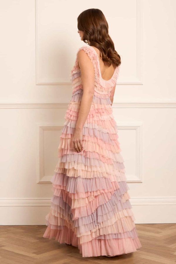 The Petra Ruffle Gown in Desert Rainbow is a heritage Needle & Thread design featuring soft,gathered tulle frills that graduate in size towards the hem for a dramatic effect. The gown transitions through soft pastel ombré hues,adding to its ethereal beauty. Designed with delicate frill trims on the square neckline and armholes,enhancing its romantic feel. The skirt layers soft tulle and net,completing the gown’s enchanting,romantic style.