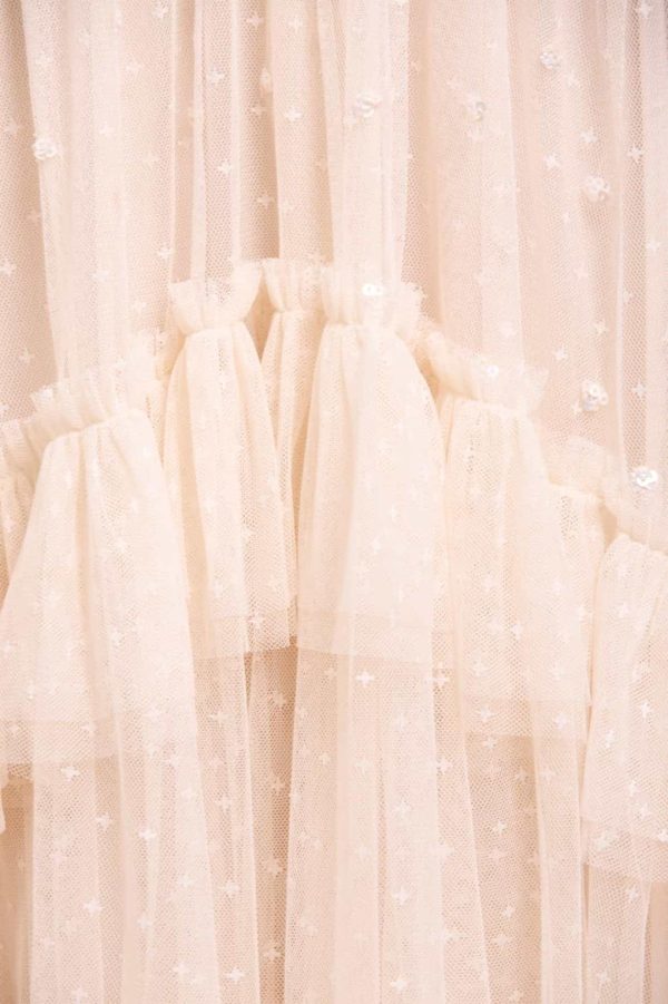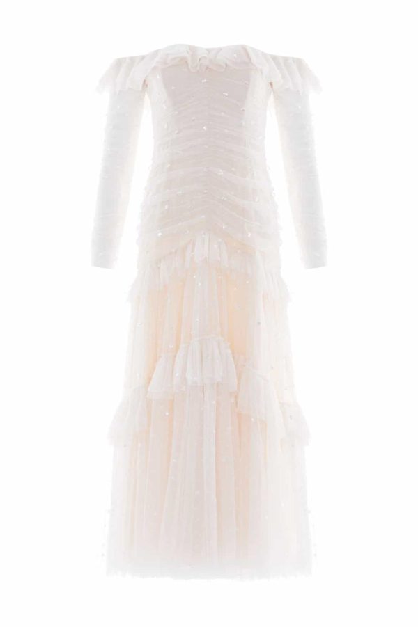 The Sequin Glimmer Rouched Off-Shoulder Gown in Cream. Make an entrance in this show stopping gown,featuring an off-shoulder neckline adorned with cascading circle-cut frills that create a soft,romantic silhouette. Crafted with glittering sequin dot motifs,enhanced with a high-shine foil coating for an ultra-lustrous finish,which gently scatters down the layered tulle skirt,adding ethereal movement. The ruched bodice and sleeves flatter the figure,while the tiered skirt with topstitched gathered frills lends delicate depth and charm. An internal stretch power mesh corset provides structure,comfort,and support,detailed with soft boning encased in grosgrain ribbon and adjustable hook-and-eye fastenings for a refined,couture finish.