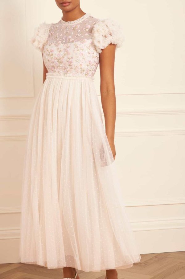 The Dahlia Bodice Round Neck Ankle Gown in Cream. The bodice of this gown is scattered with intricate floral embroidery in pink pastel tones. Beautifully decorated with shimmering silver sequins in delicate dot motifs. The skirt is developed with layers of our signature Needle & Thread tulle for a statement look. The perfect style for all your upcoming events and beyond.