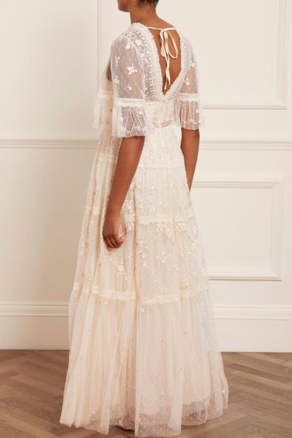 The Lottie Lace Gown in Champagne. A signature Needle & Thread style,updated for the new season ahead. Taking inspiration from Victorian lace,the Lottie features intricately embroidered artwork in a tonal thread featured on delicate tulle. Lace trims border the neckline and frame each tier of the skirt. This embroidered lace gown has sheer,romantic sleeves and our signature grosgrain ribbon at the waist. The perfect gown to take you from day to night.