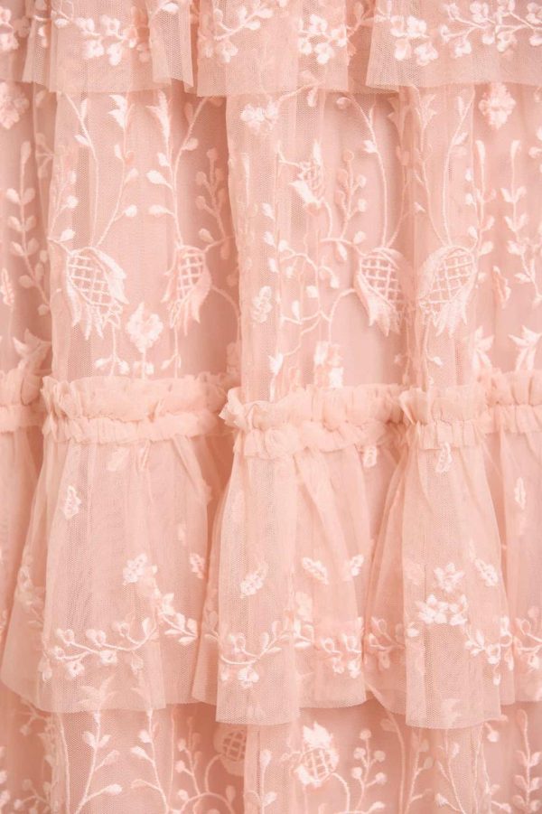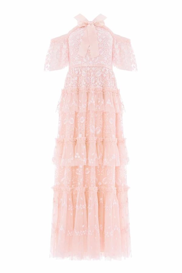 The Primrose Gown in Apricot is a classic Needle & Thread design inspired by Victorian styling. Featuring a statement satin ribbon bow,delicate floral embroidery,and perfectly layered tulle frills on the skirt,this gown is a timeless and elegant piece.