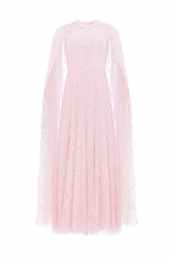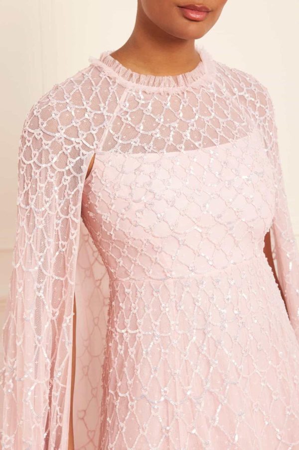 NEEDLE & THREAD EXCLUSIVE. The Heart Lattice Ankle Gown in Dusk Pink. This gown is decorated with intricate embellishment made using the smallest sequins for exquisite detailing. Beautifully designed with heart-shaped motifs in a lattice layout. This gown features our new floor-length cape for romantic detailing and a statement look. Make an entrance at your next event.