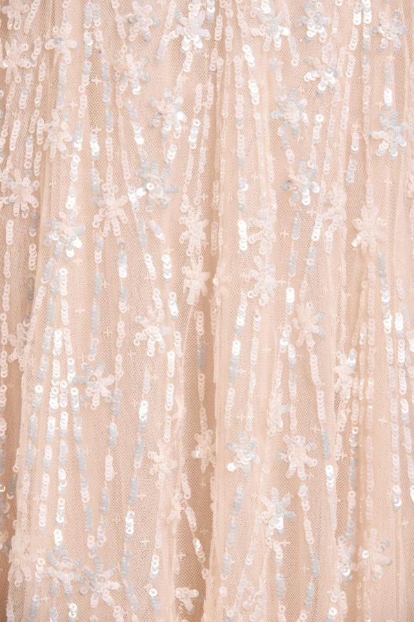 NEEDLE & THREAD EXCLUSIVE. The Comet Ankle Gown in Cream. This beautiful statement piece showcases glittering sequin shooting star motifs,inspired by the night sky,with embellishments that delicately trail down to the hem. This gown features our new floor-length cape,adding an element of romantic elegance. The skirt is crafted from layers of net and tulle,creating a full,voluminous silhouette. The sequins have a special high-shine,gloss finish created from extra foil coating added to each sequin to create this extra lustrous look. Make a memorable appearance in the Comet Ankle Gown.