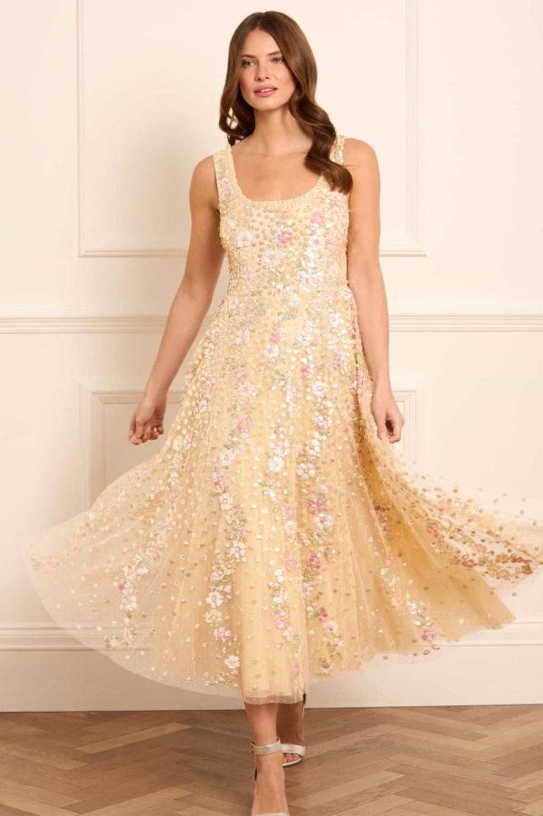 The Confetti Scoop Neck Ballerina Dress in Buttermilk/Mult. This dress is adorned with delicate floral sequin embellishments that scatter gracefully,creating a romantic confetti effect. Each sequin is coated with a high-shine foil,adding a lustrous finish. The elegant scoop neckline is highlighted with Needle & Thread’s signature frill,while the skirt features layers of soft tulle,adding depth and romance to this exquisite piece.