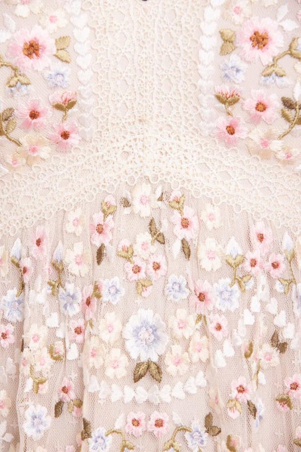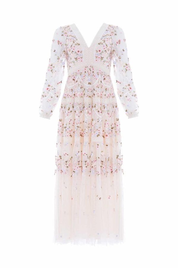 The Garland Ribbon Ankle Gown in Cream This embroidered gown is inspired by Victorian lace trims. Beautifully designed with floral embroidery in soft pastel tones. Developed with a V-shaped waist seam to create a flattering,effortless fit. This gown is adorned with intricate lace trims for signature Needle & Thread detailing. A pretty piece you’ll forever treasure.