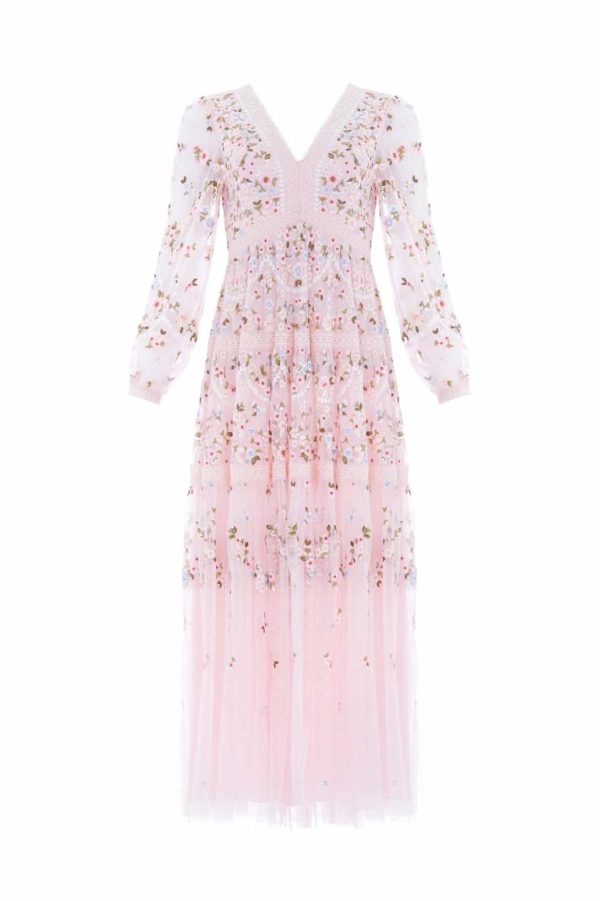 The Garland Ribbon Ankle Gown in Peony Pink. This embroidered gown is inspired by Victorian lace trims. Beautifully designed with floral embroidery in soft pastel tones. Developed with a V-shaped waist seam to create a flattering,effortless fit. This gown is adorned with intricate lace trims for signature Needle & Thread detailing. A pretty piece you’ll forever treasure.