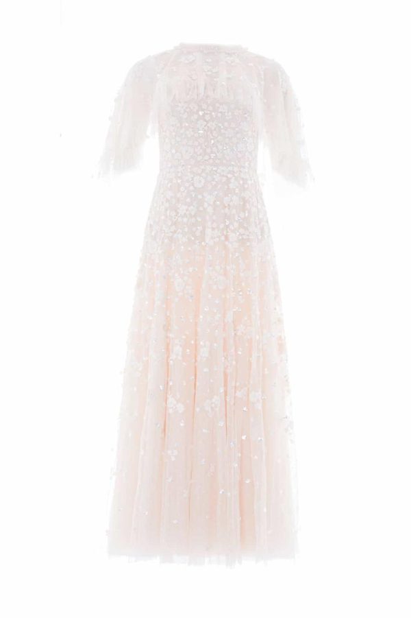 NEEDLE & THREAD EXCLUSIVE. The Dahlia Ditsy Short Cape Ankle Gown in Cream. This gown is beautifully decorated with shimmering silver sequins in delicate dot motifs and intricate floral embroidery in tonal tones. Featuring our new short-length cape for romantic detailing. Developed with layers of net and tulle for a full and voluminous skirt. The perfect statement style for a special occasion.