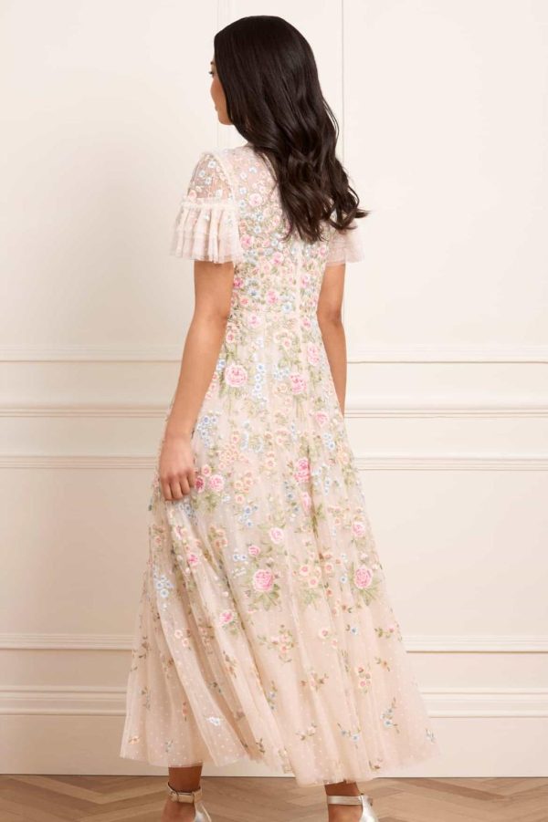 The Antoinettes Floral Round Neck Ankle Gown in Cream. A nod to the lavish beauty of Versailles,the Antoinette Gown showcases exquisite multicoloured floral embroidery,cascading in delicate clusters toward the hem. The round neckline is framed by signature Needle & Thread tulle ruffles,while short sleeves are finished with softly gathered tulle frills for a whimsical touch. Crafted with generous layers of net and tulle,the ankle-length skirt flows into a graceful,sweeping hemline—bringing timeless romance to any occasion.