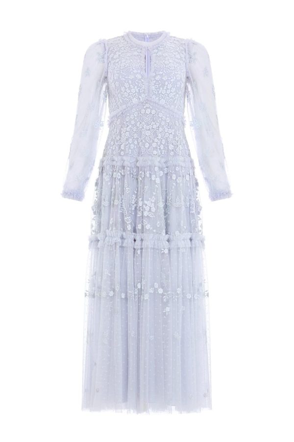 The Autumn Lace Long Sleeve Ankle Gown in Dusk Blue. This signature Needle & Thread style is designed with floral motif embroidery inspired by antique lace designs. This gown is developed with romantic sheer long sleeves,and a gathered tiered hem,and is created from layers of soft tulle to create a flattering silhouette. A classic and contemporary style.