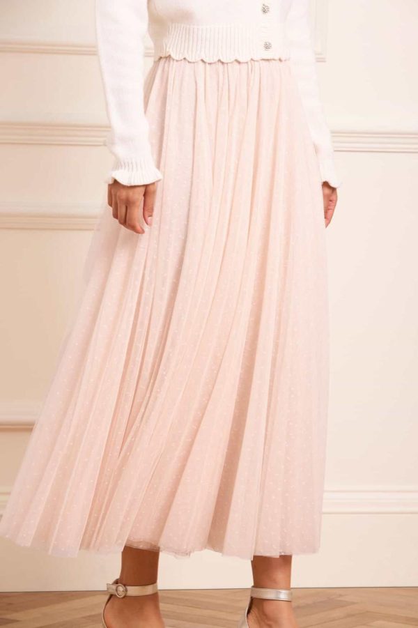 NEW SEASON. The Ballet Kisses Ankle Skirt in Cream/Opal. A dreamy layering piece made from soft signature ‘x’ motif tulle. Featuring frothy,tiered layers and a comfortable fitted waistband,this skirt offers graceful movement and a ballet-inspired silhouette. Style with the Embellished Collar V-Neck Cardigan for refined yet romantic day-to-evening dressing.