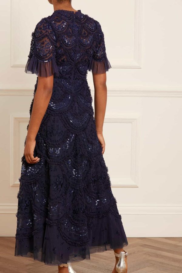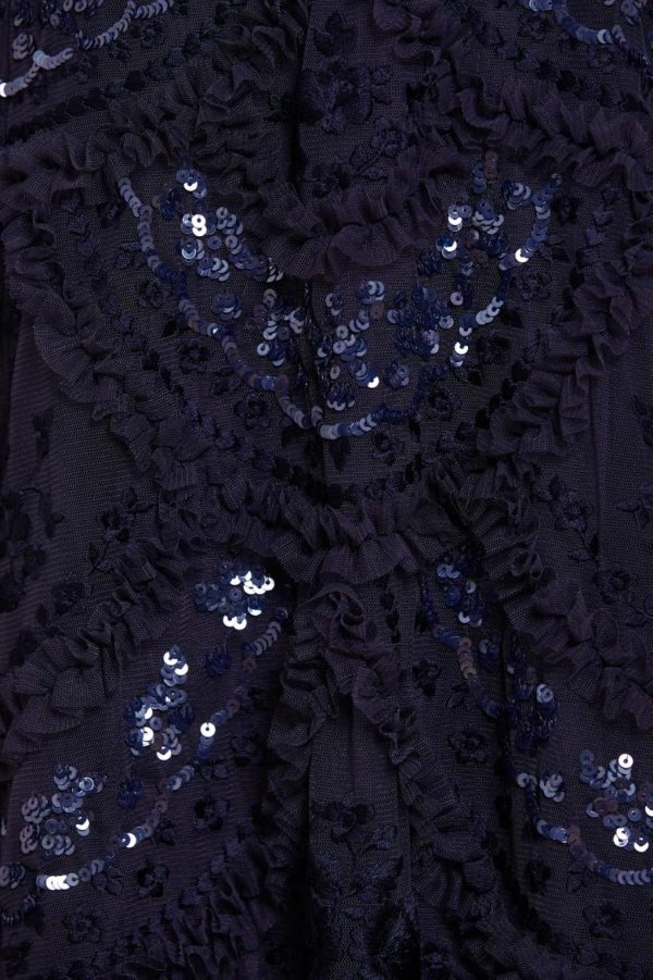 The Carmen Ruffle Ankle Gown in Navy Blue. Delight in a vision of true romance with the Needle & Thread Carmen Ruffle Ankle Gown. With expert craftmanship,the soft layers of tulle and exquisite embroidery evokes a sense of a timeless beauty. Layers of gently ruffled tulle create our signature Needle & Thread textured look,so that you can show off a dazzling silhouette. With floral vine borders and glistening sequins,you can be sure that our romantic Carmen Ruffle Gown will be a show stopping piece in your wardrobe.