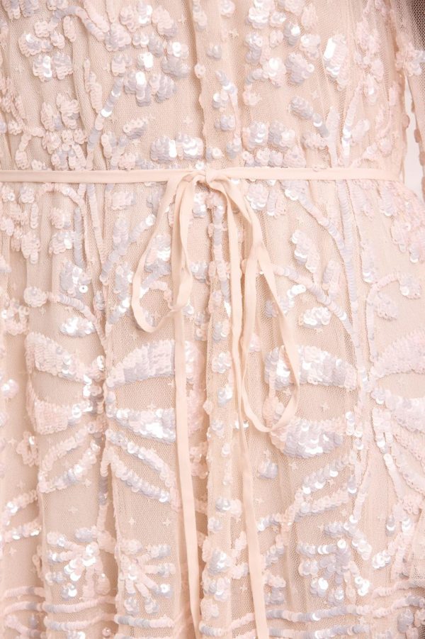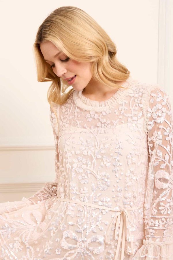 NEEDLE & THREAD EXCLUSIVE. The Celia Long Sleeve Ankle Gown in Cream/Dusk Pink. This statement gown is designed with romantic artwork featuring ornate florals and ribbon bows,densely embellished with shimmering sequins for exquisite detailing. Designed with an effortless loose fit with soft,playful tulle frills on the hem and cuffs. A key piece in our collection.