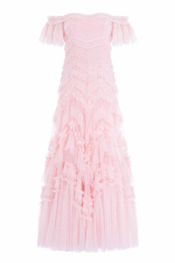 The Elia Off-Shoulder Gown in Dust Pink. This textile gown is beautifully designed with soft,delicate tulle ruffles that gradually increase in size towards the hem. Crafted with a romantic off-the-shoulder design and developed using layers of soft tulle trimmed with frills,adding to this statement look. The internal corset construction in stretch power-mesh ensures comfort and fit while maintaining the garment’s shape and hold. The skirt is made up of generous layers of net and tulle with a sweeping hemline. Expect all eyes on you in this statement style.