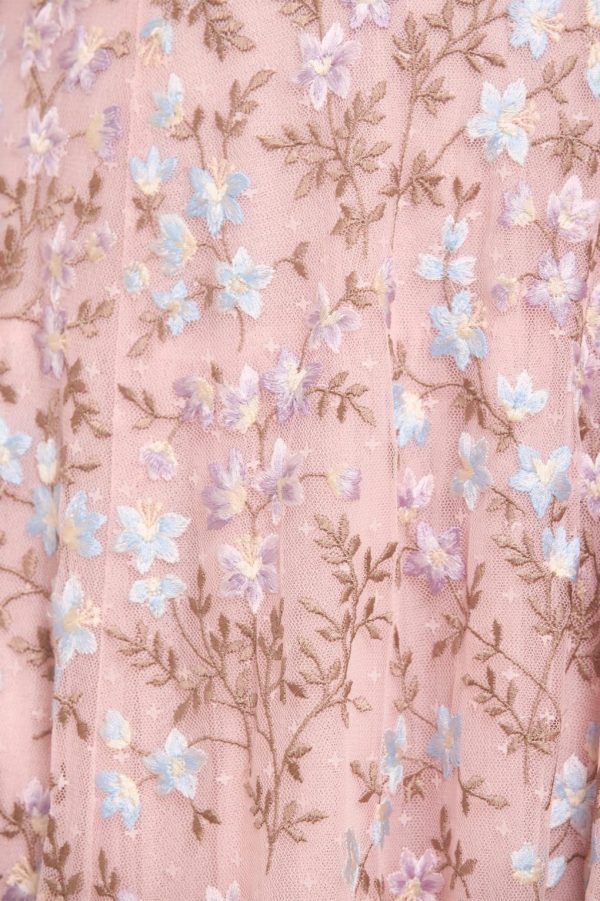 The Everett Bloom Round Neck Ankle Gown in Dusk Pink/Multi. This beautiful gown features exquisite,embroidered artwork inspired by a vintage archive print that showcases floating florals. Beautifully decorated with floral clusters cascading gently toward the hem,enhancing the romantic charm. Designed with fluted sleeves adorned with frothy tulle ruffles and embroidered floral motifs,while the neckline,shoulders,and cuffs feature signature Needle & Thread tulle frills for a touch of romantic elegance. The skirt is composed of generous layers of net and tulle,culminating in a sweeping hemline that adds to the gown’s enchanting allure.
