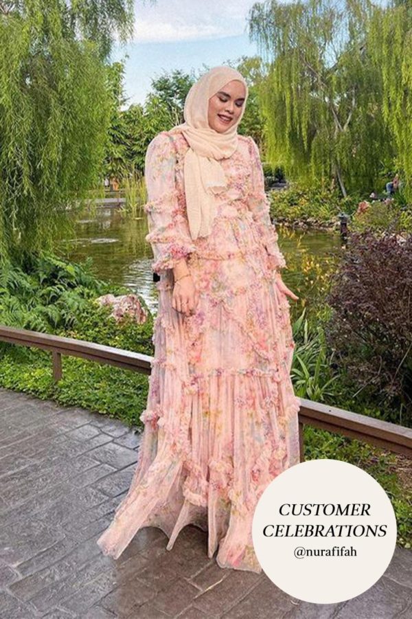 NEW SEASON. Floral Diamond Ruffle Gown in Topaz Pink. This eye catching piece is crafted from delicate ruffled tulle with an all over vintage print taken from an early 1900’s hand painted fabric design. A romantic look featuring voluminous cuffed sleeves and a flattering skirt that skims the body to gently increase in fullness,creating stunning movement within the tulle. This Victorian inspired look with a contemporary edge will be the star of your wardrobe.