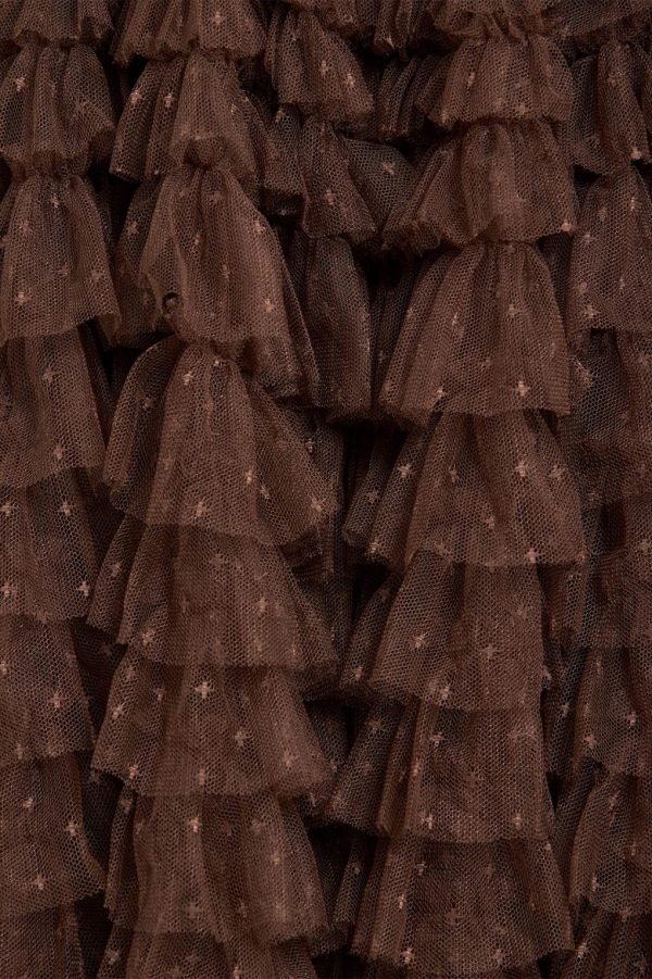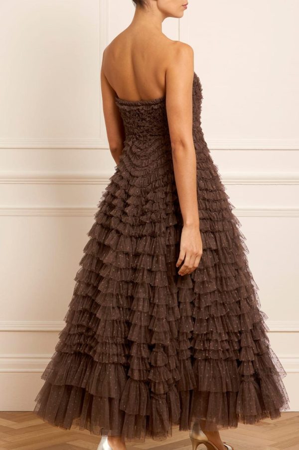 The Hattie Ruffle Strapless Ankle Gown in Chocolate. This gown is elegantly developed with layers of frothy tulle creating a soft,wavy textile. This strapless gown features signature Needle & Thread ruffles and frills for intricate,romantic detailing. Make the ultimate statement in the Hattie at your next event.