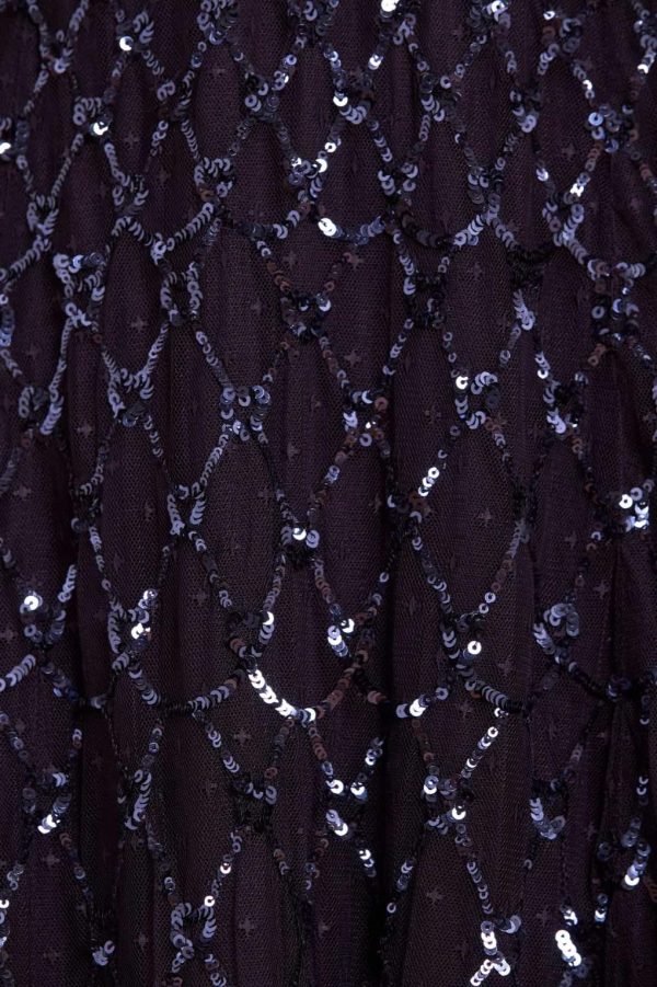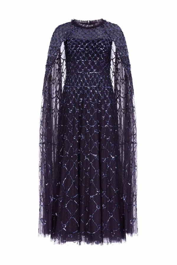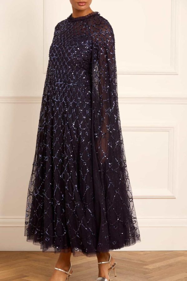The Heart Lattice Ankle Gown in Midnight. This gown is decorated with intricate embellishments made using the smallest sequins for exquisite detailing. Beautifully designed with heart-shaped motifs in a lattice layout. This gown features our new floor-length cape for romantic detailing and a statement look. Make an entrance at your next event.