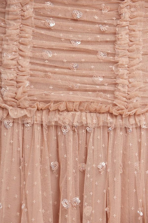 The Love Heart Rouched 0ff-Shoulder Gown in Sand. This gown is decorated with sequins in love-heart motifs creating an all-over shimmering effect. Beautifully designed with a figure hugging silhouette featuring gentle ruching throughout the body to create a flattering effect. Developed in power mesh fabric for stretch and comfort. A season favourite at Needle & Thread HQ.