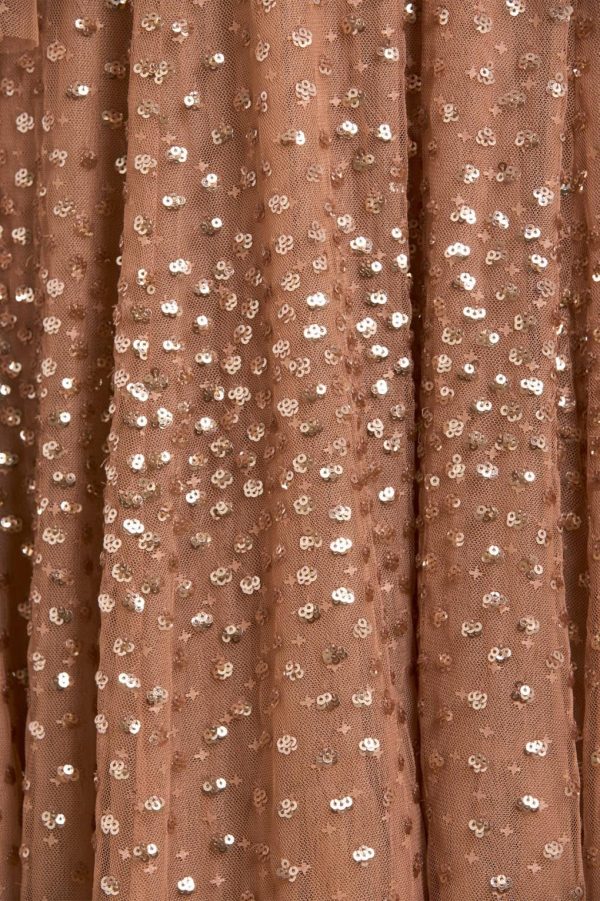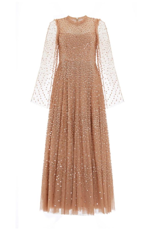 The Scatter Dot Round Neck Ankle Gown in Mocha. This embellished gown is decorated with exquisite shimmering dot motifs,undulating in wave formations for a captivating glittering effect. The round neck bodice is trimmed with signature Needle & Thread tulle trims at the neckline and shoulders for romantic detailing. The elegant long fluted sleeves are adorned with tiny sparkling sequin motifs,and the skirt is made up of generous layers of net and tulle with a sweeping hemline. This magical piece is perfect for an upcoming special occasion and beyond.