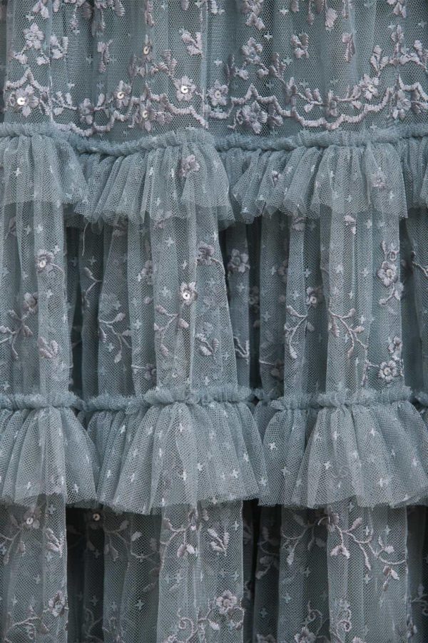 The Blossom Lace Ankle Gown in Thistle Blue. A statement gown full of timeless elegance. Designed with a voluminous silhouette and cascading layered frills,this gown is adorned with delicate embroidery and subtle clear sequins that catch the light with every movement. A structured net layer adds definition,enhancing the gown’s dramatic shape. A truly show-stopping piece,perfect for unforgettable moments.