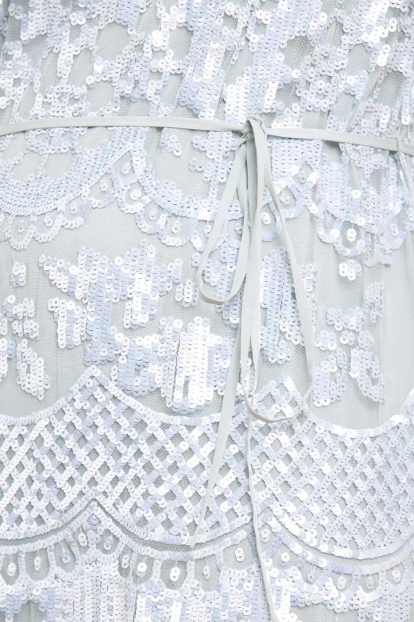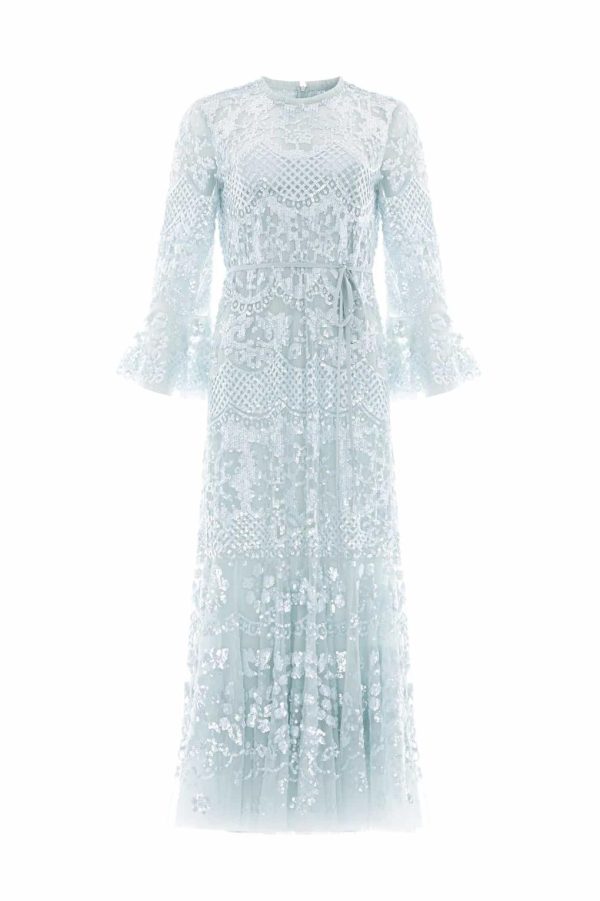 The Snowdrop Ankle Gown in French Blue. A heritage Needle & Thread design,this timeless gown features shimmering sequin artwork inspired by antique tablecloths from the early 1900s. Intricate floral borders and lattice patterns create a striking,heirloom-like embellishment. Designed for effortless elegance,the gown has a relaxed fit with a slim crepe waist tie for versatile styling. Crafted with romantic fluted sleeves,a softly tiered hem,and signature frill detailing at the neckline complete the look.
