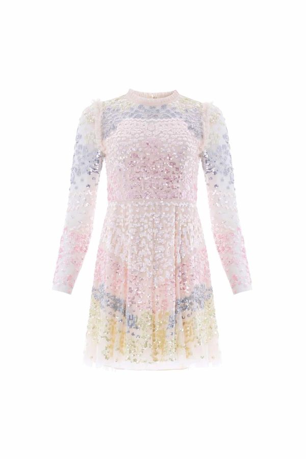 The Angeline Sequin Mini Dress in Cream is inspired by antique lace tablecloths from the 1900s,featuring intricate sequin embellishments in a delicate ombré effect. Beautifully decorated with pastel sequins to create a soft gradient towards the hem,with a high-shine finish for added lustre. Crafted in soft tulle with signature frills,the dress includes slim sleeves and soft tulle ruffles at the shoulder and neckline. The layered tulle and net skirt adds to its ethereal,romantic charm,making it a perfect blend of classic and contemporary style.