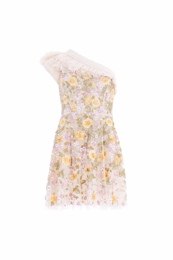 The Florine One-Shoulder Mini Dress in Cream features luxurious embroidery inspired by a hand-painted archive print from the 1900s,showcasing rose blooms and delicate trailing florals. The one-shoulder design is enhanced with soft tulle ruffles,adding a romantic touch and signature Needle & Thread styling. The skirt is crafted from layers of soft tulle,creating an elegant,romantic look. Make an entrance at your next event.