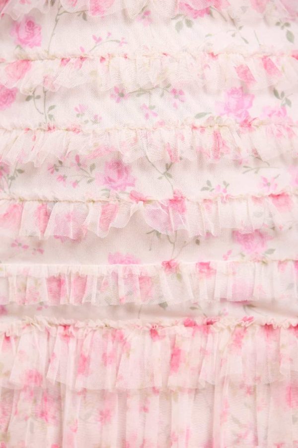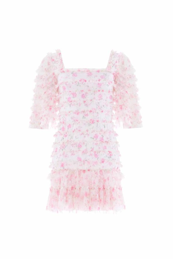 The Rose Ditsy Short Sleeve Micro Mini Dress in Moonshine/Pink. This gown features a romantic floral print inspired by 1800s hand-painted wallpaper. The slim silhouette is shaped with two layers of stretch power-mesh for comfort and support. Crafted with delicate tulle sleeves and skirt add to its ethereal charm,while signature Needle & Thread frills create a flattering,flowing effect. The square neckline,fluted sleeves,and gathered skirt bring elegance and timeless beauty to this gown. A piece you’ll cherish forever.