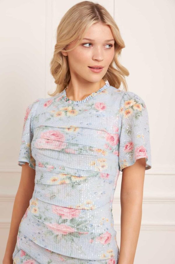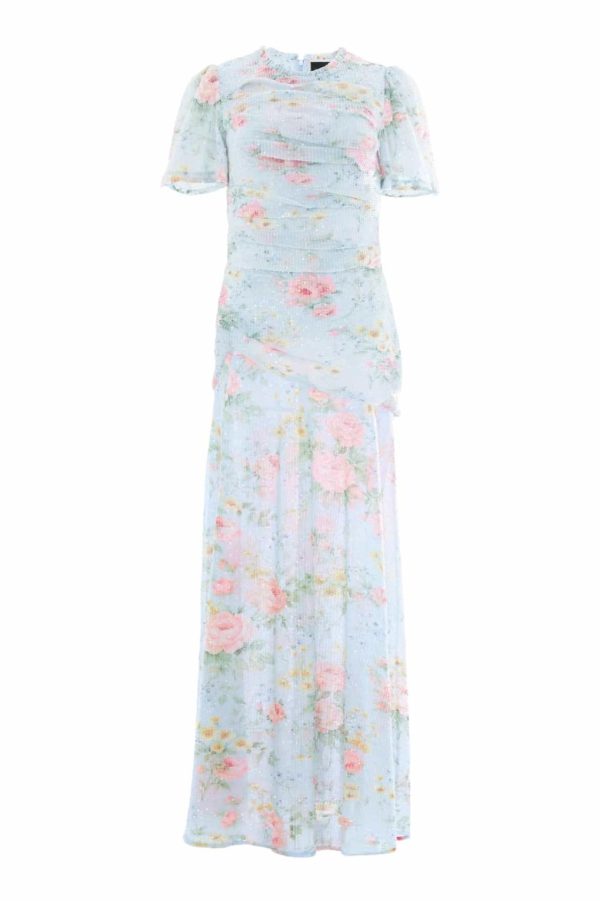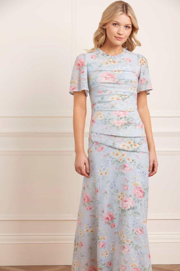 The Pompadour Garden Sequin Gown in French Blue. Inspired by the opulent wall coverings of the Palace of Versailles,this gown features luxurious hand-painted floral bouquets and trailing ditsy motifs. Crafted with tiny clear sequins delicately applied for a transparent,shimmering effect. The slim silhouette is beautifully draped,flattering the body,while the fluid,sweeping skirt adds movement. Short sleeves complete the refined,elegant look,making this gown a true statement of luxury and craftsmanship.