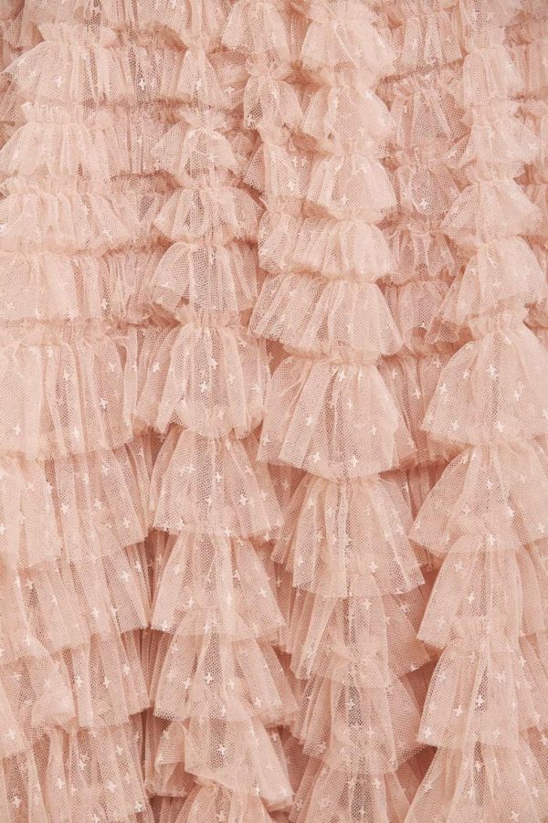 The Hattie Ruffle Skirt in Pebble. This textile skirt is engineered with layers of soft tulle and net to create a signature Needle & Thread style. Crafted with individual ruffles to create a beautiful,frilly texture. Designed with a sweeping hemline and finished at the waist with a satin ribbon for extra detail. We recommend pairing this skirt with our knitwear for a romantic Needle & Thread look.