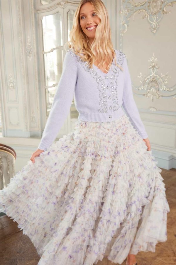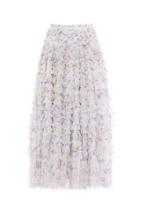 The Ophelia Ditsy Hattie Ruffle Ankle Skirt in Moonshine/Blue. This romantic trailing print is taken from an archive,hand-painted artwork from the early 1900s,depicting soft,whimsical ditsy floating florals. Crafted with individual ruffles to create a beautiful,frilly texture. Designed with a sweeping hemline and finished at the waist with a satin ribbon for extra detail. We recommend pairing this skirt with our Embellished V-Neck Short Cardigan for a romantic Needle & Thread look.