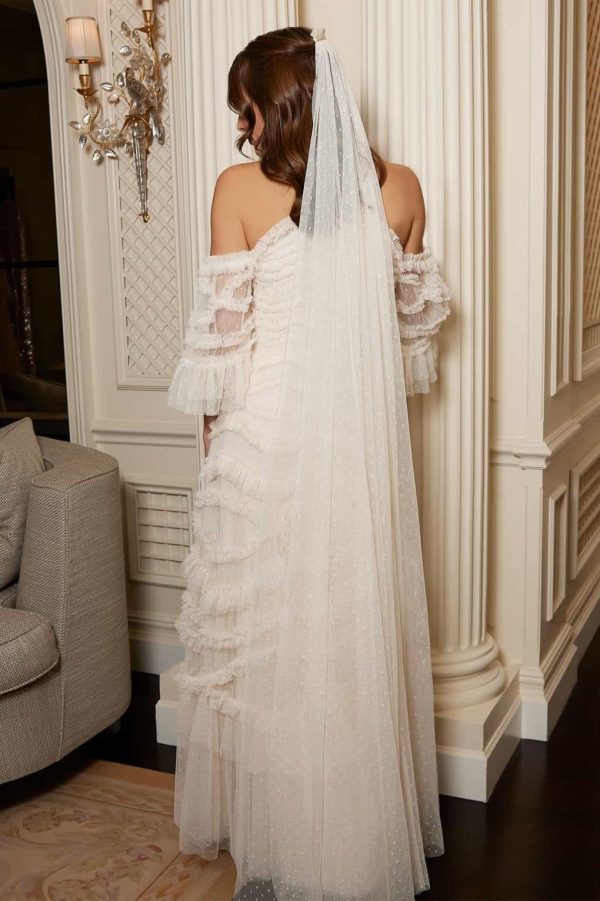 NEEDLE & THREAD EXCLUSIVE. The Kisses Long Veil in Cream is an elegant,floor-sweeping design crafted from delicately gathered soft tulle for a romantic finish. It secures with a silver hair comb wrapped in satin ribbon and is beautifully edged with signature Needle & Thread tulle frill. A perfect,special touch to complete your bridal look.