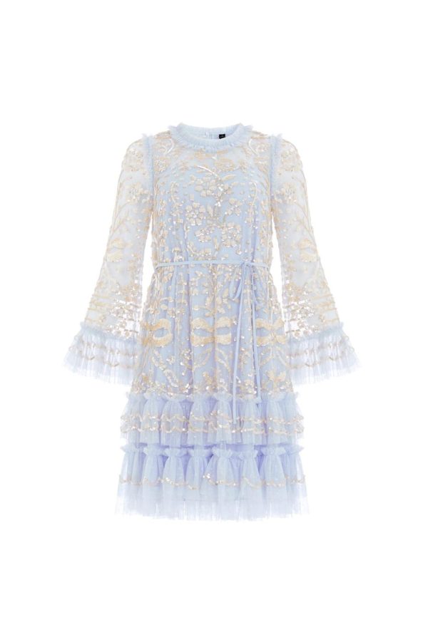 The Celia Long Sleeve Mini Dress in Dusk Blue/Gold. This statement dress is designed with romantic artwork featuring ornate florals and ribbon bows,densely embellished with shimmering sequins for exquisite detailing. Crafted with an effortless loose fit with soft,playful tulle frills on the hem and cuffs. A key piece in our collection.