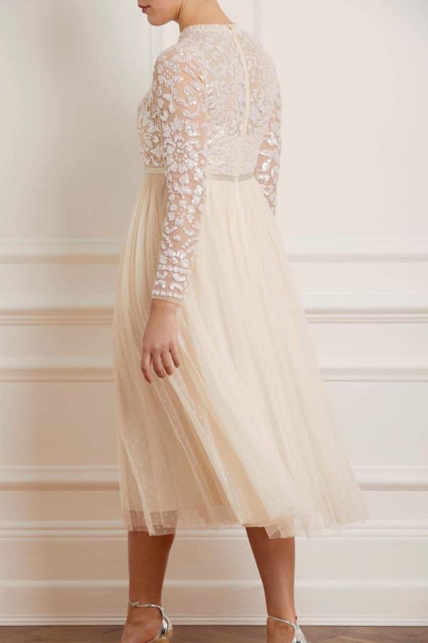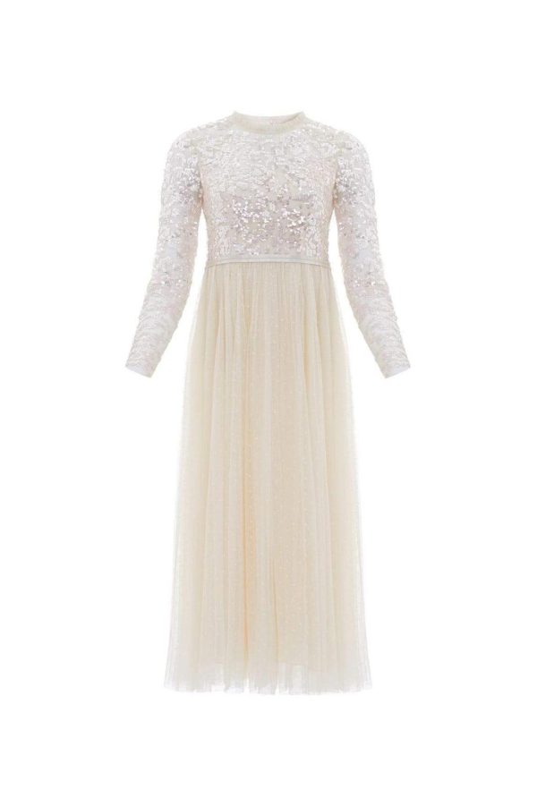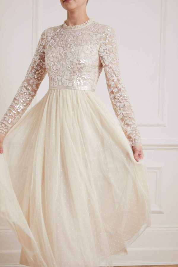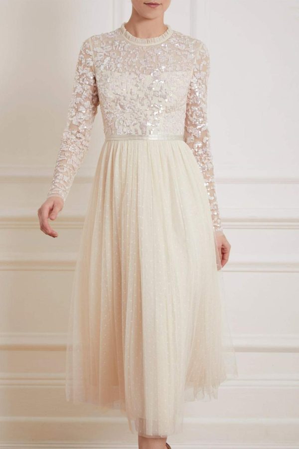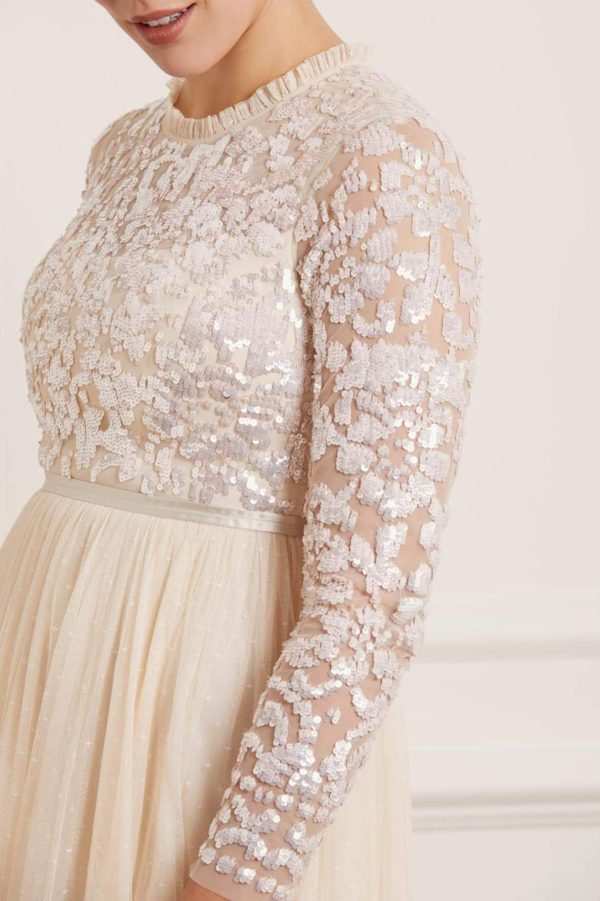 NEEDLE & THREAD EXCLUSIVE. The Tempest Bodice Ballerina Dress in Champagne / Pink. This beautiful ballerina dress is inspired by a vintage lace tablecloth design,embellished with shimmering pink sequins all over the bodice. Designed with long sleeves,a kisses tulle multi-layered skirt,and frill trim detailing around the neck. Make an entrance in the Tempest.
