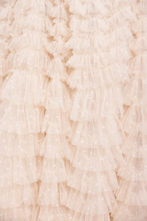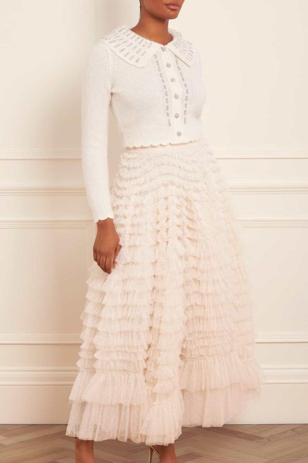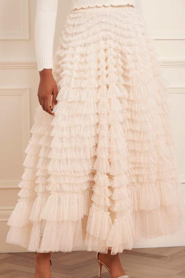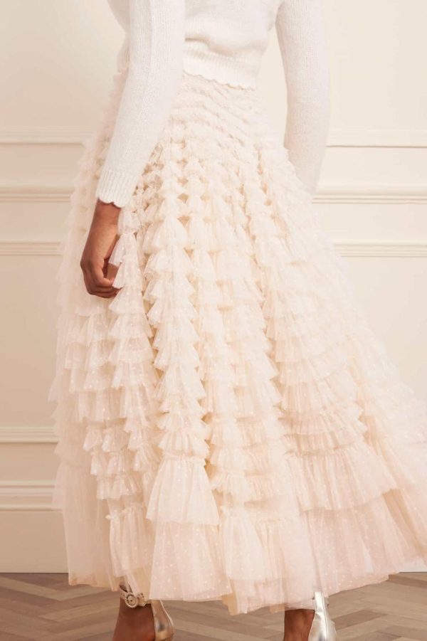 The Hattie Ruffle Skirt in Cream. This textile skirt is engineered with layers of soft tulle and net to create a signature Needle & Thread style. Crafted with individual ruffles to create a beautiful,frilly texture. Designed with a sweeping hemline and finished at the waist with a satin ribbon for extra detail. We recommend pairing this skirt with our knitwear for a romantic Needle & Thread look.